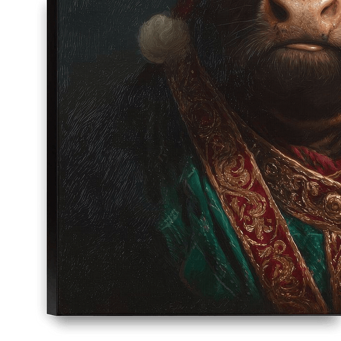 This artwork shows a proud Scottish highlander with a soft winter look. The warm orange fur falls playfully over the forehead giving the portrait a friendly charm. The Christmas bonnet immediately brings a festive atmosphere to the picture. The green cloak is richly decorated with red and gold patterns that give it a luxurious and…