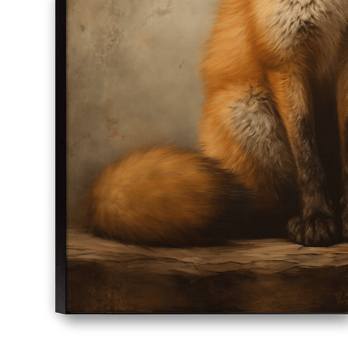 This image was created using a digital painting technique that mimics the classic painting style, with rich textures and carefully placed brushstrokes. The subtle transitions between light and shadow create depth and an almost tactile quality to the fur. The background is carefully aged to create a warm, rustic atmosphere, adding to the work's timeless appeal. This technique focuses on detailed and refined finishing, giving the fox a characterful and vibrant look, as if it had crossed over into the artwork straight from nature.
