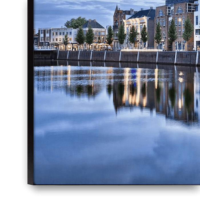 Mansions against a blue sky with dramatic clouds, mirrored in harbor at twilight, Breda, The Netherlands