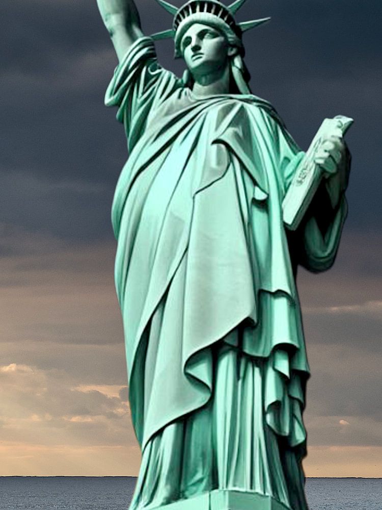 The Statue of Liberty stands on Liberty Island in New York City harbour. This 46-metre-tall statue (93 metres including pedestal), a gift from France, depicts the Roman goddess Libertas, carrying in her right hand a torch and in her left a plaque with the date 4 July 1776.