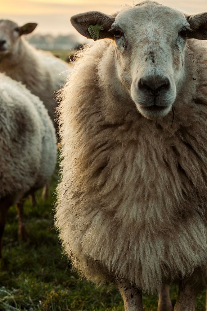 Curious sheep at sunset in a wintery landscape. The sheep are nicely covered in wool. A nice flock together.