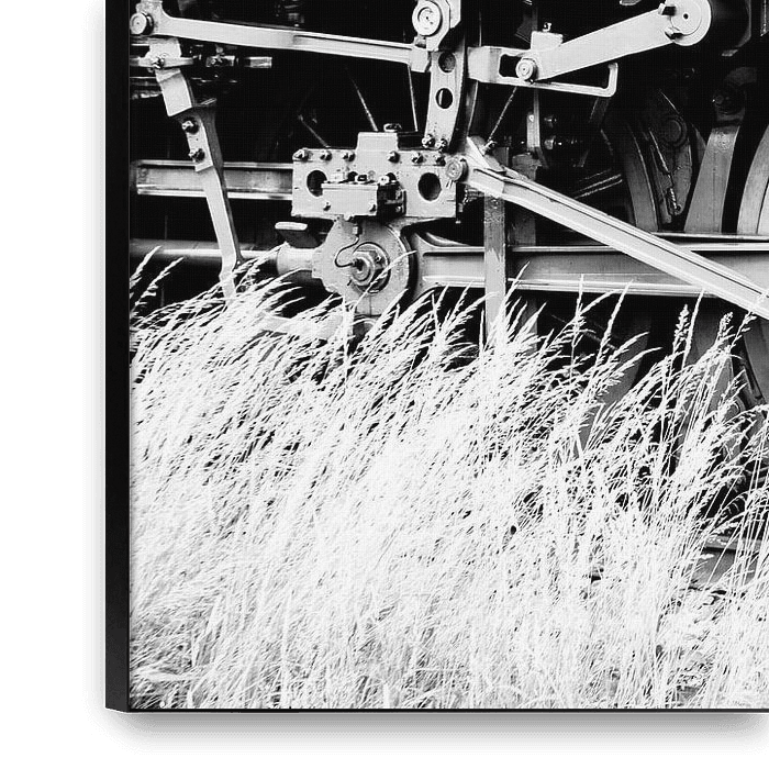 Steam locomotive wheels close up behind the grass growing along the railway track. Black and white photograph.