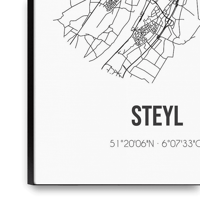 Black and white map, street map or street plan of Steyl. Steyl is located in the municipality of Venlo, province of Limburg. The city map includes all public roads in Steyl. Furthermore, the map features the coordinates of the center of Steyl.