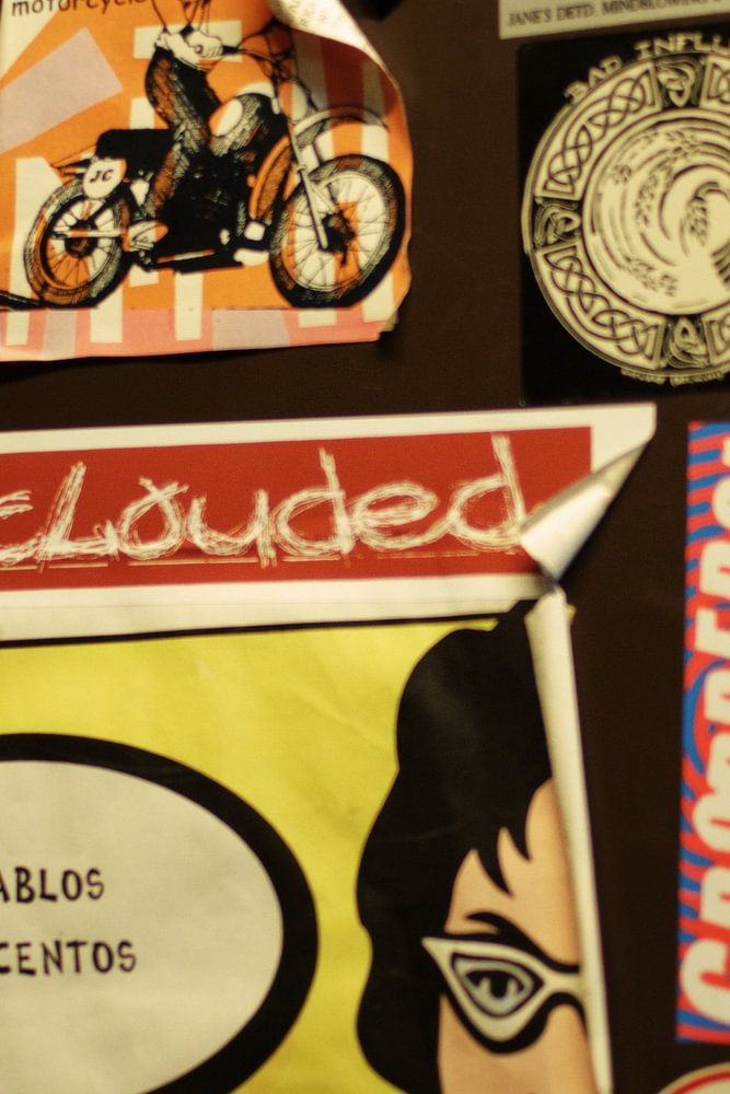 This close-up of a wall covered with band stickers in a music studio captures the raw energy of punk music culture. The collection of stickers from local, national and international punk bands forms a colourful collage of anarchic and alternative iconography, typical of the DIY aesthetic of the punk movement. Each logo and image tells its own story, together symbolising the rebellion and freedom at the heart of this style of music. Perfect for fans of underground music and those who want to capture the visual power of subcultures in their interiors.