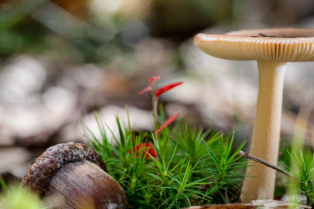 Beautifully lit mushroom in a fresh and radiant autumn forest. Picture with bokeh, contrasts and beautiful sharpness in a Dutch forest during autumn.
