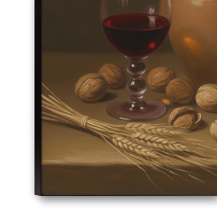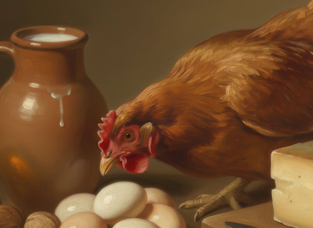 This artwork is an atmospheric, warm classical still life that combines rural simplicity and rich tradition. In the foreground, we see a curious chicken among a collection of eggs, nuts, wheat, cheese, milk and a glass of red wine, symbols of abundance, domesticity and craftsmanship. The soft light and realistic brushwork are reminiscent of the old masters of the 17th century.