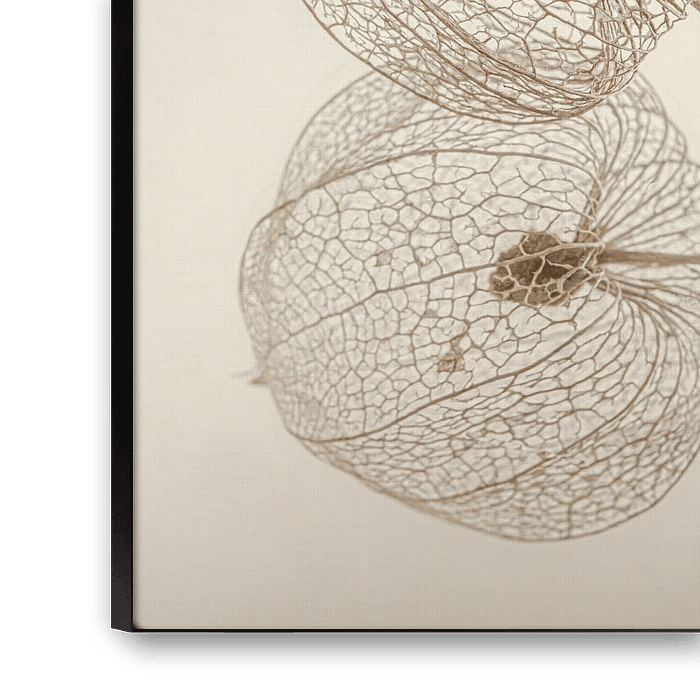 "Still life: A lantern of the lantern plant" is a picture of a lantern of the lantern plant that is already almost digested. The skeleton of the veins can be seen beautifully as a result. You can see the reflection of the lantern on the grey-silver beige background. Among other things, the soft light natural colours give it a peaceful look.