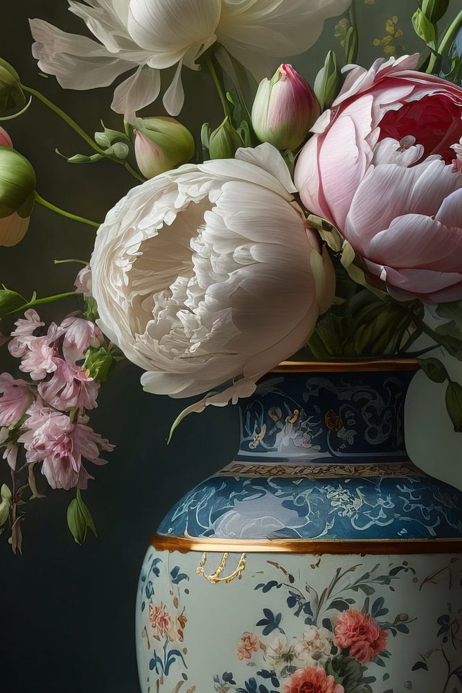 Still life in the style of 17th century master painter Balthasar van der Ast. Van der Ast painted very refined still lifes of fruit and flowers. His compositions and use of colour are very measured. Gradually his works became larger and more complex, until later in his long career he painted showy still lifes. This work was created with a mix of classical painting and modern digital art technique on a computer.