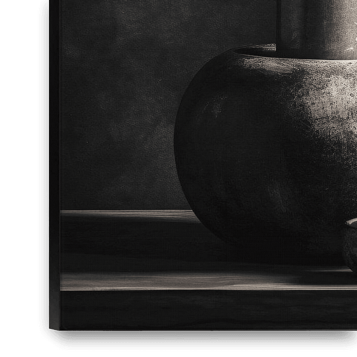 Japandi-style still life with a vase,bowls and stones in a dark colour scheme with matte natural brown, taupe and grey tones.