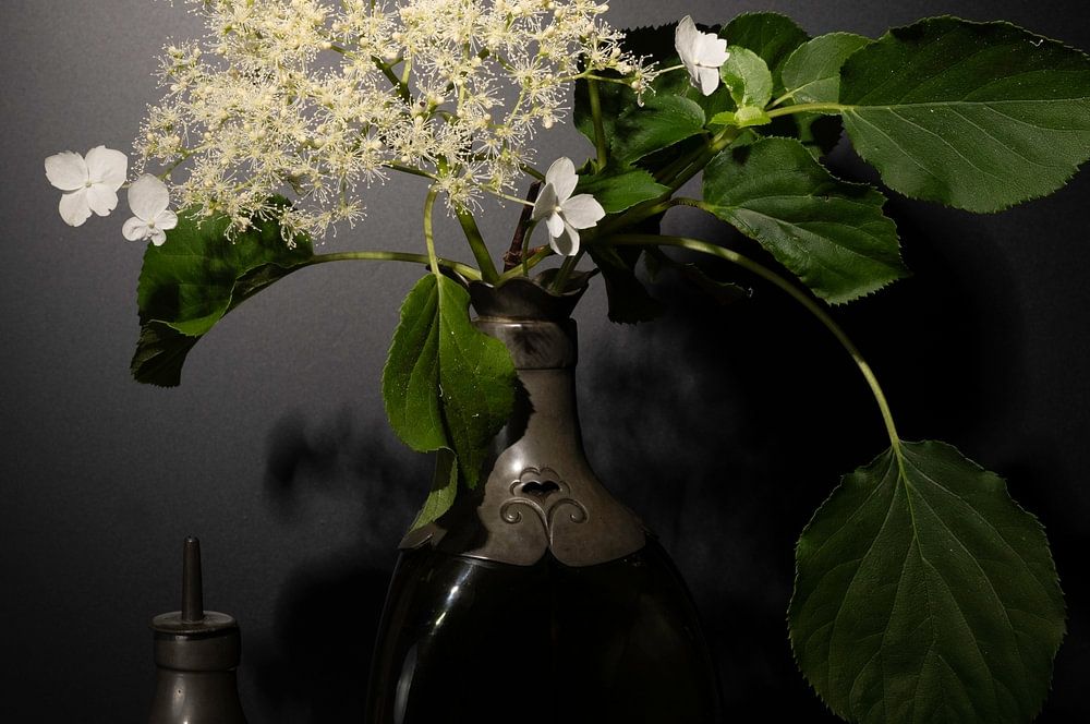 Still life climbing hydrangea in green vase by Gaby Hendriksz