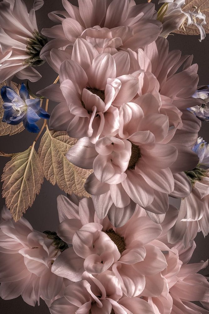 Still life collection II - Pink flowers. Flower bouquet. This still life consists of pink and blue flowers. The light flowers stand out beautifully against the dark background. Each flower was photographed separately, and brought together in Photoshop. It was then edited in Lightroom to create the right lighting and atmosphere.