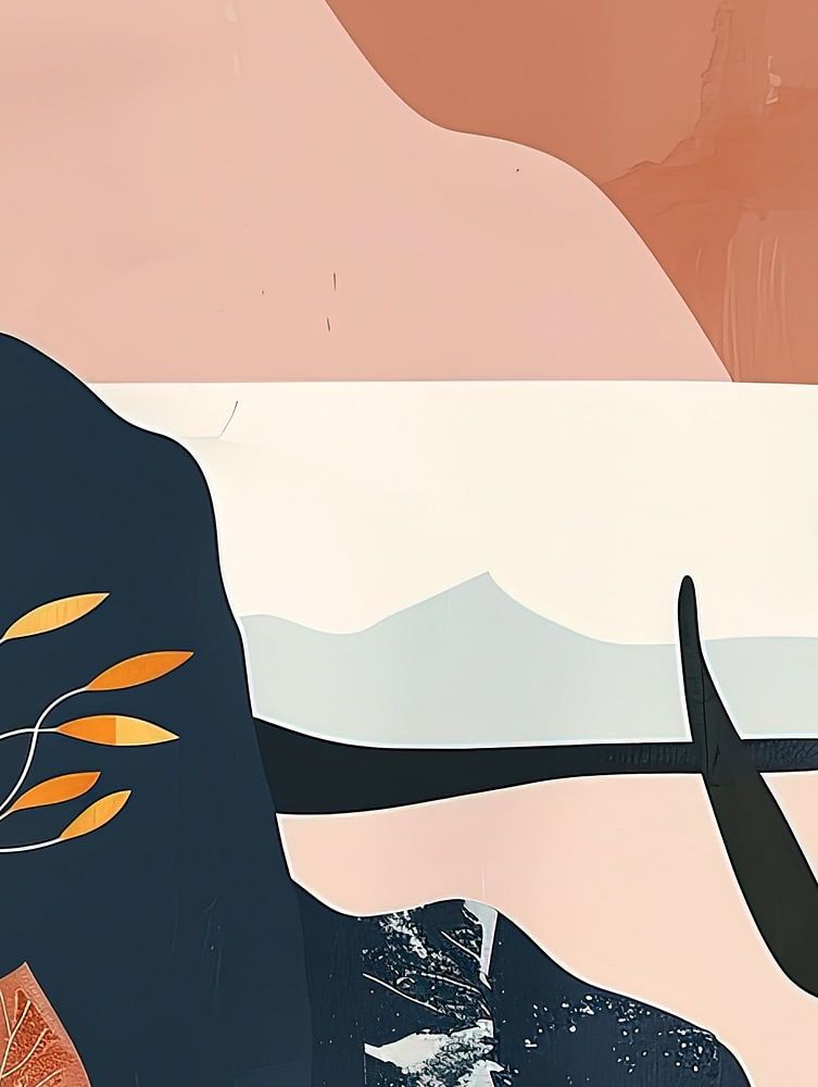 The abstract shapes and clean lines create a sense of calm and balance. The combination of warm autumn colours and cool shades of blue creates a pleasing visual harmony. The simplicity and minimalism of the artwork invite the viewer to relax and appreciate the subtle beauty of nature and shapes.
