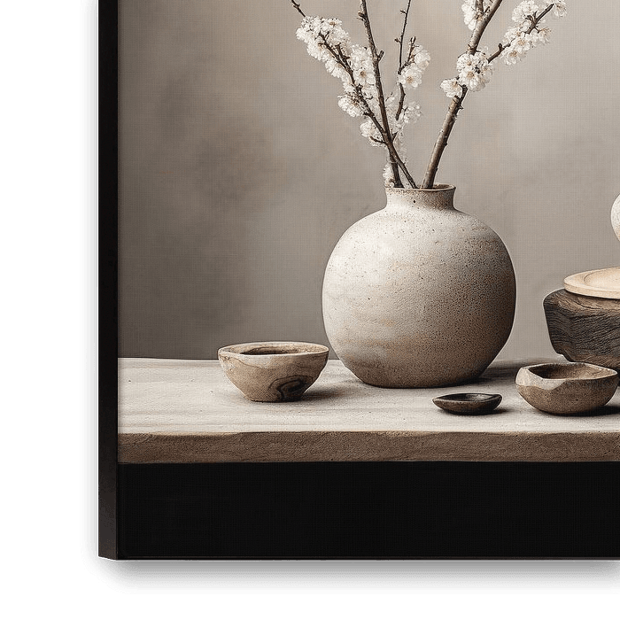 Still life in wabi-sabi style. Living style Japandi and minimalism. Wabi-sabi is a Japanese aesthetic philosophy that appreciates the beauty of imperfection, impermanence and incompleteness. It celebrates the natural cycle of growth, decay and death, and finds beauty in things that are simple, modest and unpretentious.