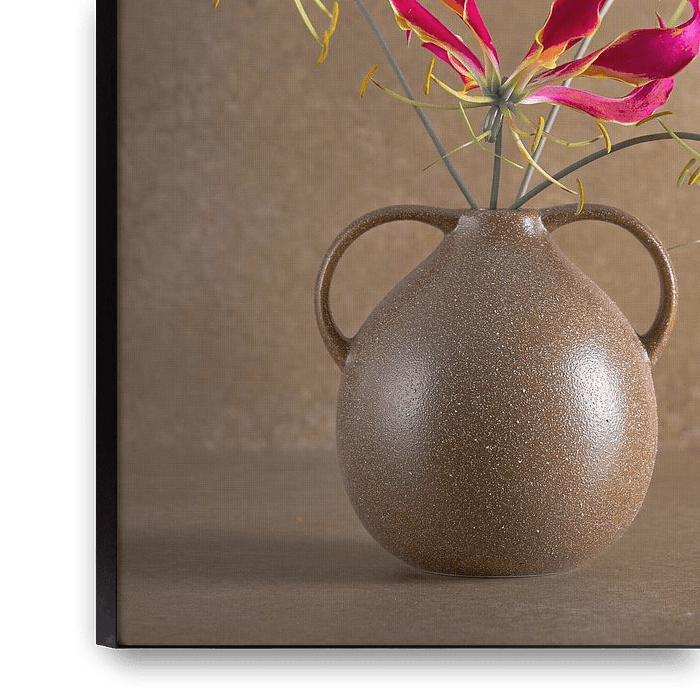 Taupe-coloured pitcher with Gloriosa also called: Flame Lily, Climbing Lily or Glory Lily. In a slightly asymmetrical composition with colourful pink flaming flowers in the picture.