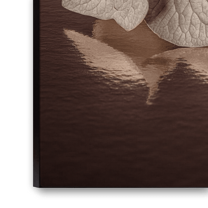 The brown background continues into the ground surface. This ground surface is reflective and textured, which breaks the reflection of the hydrangea leaf and makes it look as if the leaf is standing in water. This gives a natural abstract painterly effect to the photo. In this photo, I have pulled back the colour a little to get a more old-fashioned colour in the photo this way. (This photo is also available in warm colours and mirrored with the title: "Warm colours: Hydrangea leaf with red-brown background"