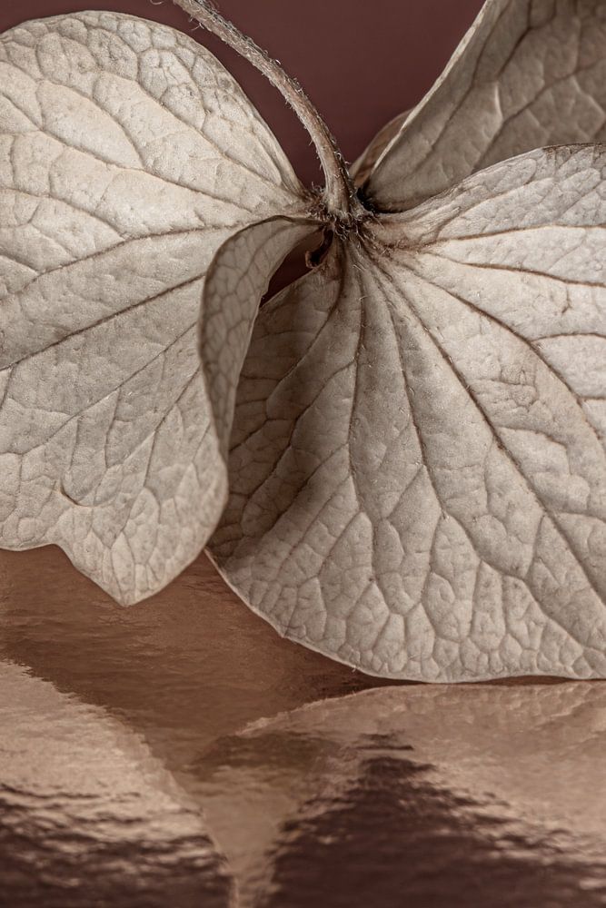 "Still life of Hydrangea leaves with watery reflection" is a still life I photographed of a hydrangea leaf that is already partially decaying. Because the sun has already partially dried the leaf, the vein structure is clearly visible.