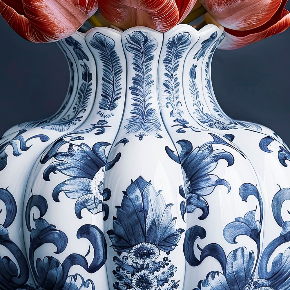 This artwork is a fresh mix of classic and modern. It shows a striking Delft blue vase, with a detailed pattern that is an ode to Dutch craftsmanship. The deep red tulips at the top bring it to life and create a powerful colour contrast. The clean design of the vase and the rich hues of the flowers make it a real eye-catcher. This piece exudes style and simplicity and is ideal for young people who love a unique piece of art in their space.