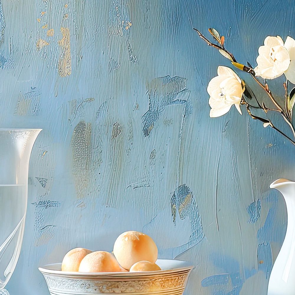 The flower petals and glassware reflect the light, creating a subtle contrast between the objects. The composition is simple and balanced, aimed at capturing a moment of stillness and tranquillity.