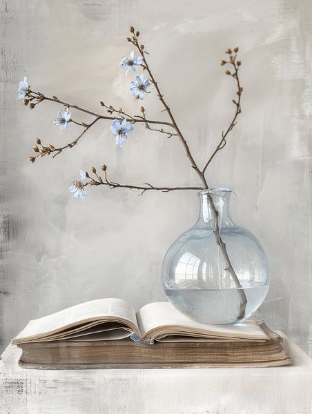 Buy this flower art Still life with a book and blossom in Japandi style by Japandi Art Studio on canvas, ArtFrame, poster and wallpaper, printed on demand in high quality.