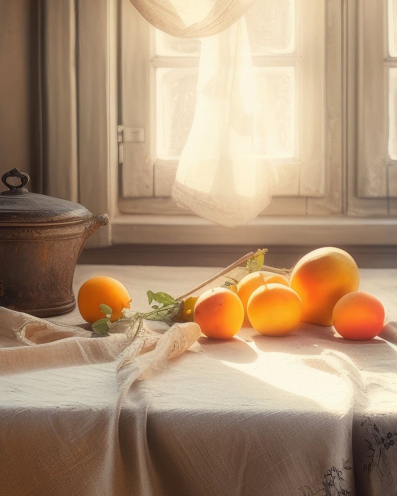 Rural still life of an old table with a tablecloth and fruit. Next to a window with beautiful light creating a soft atmosphere.