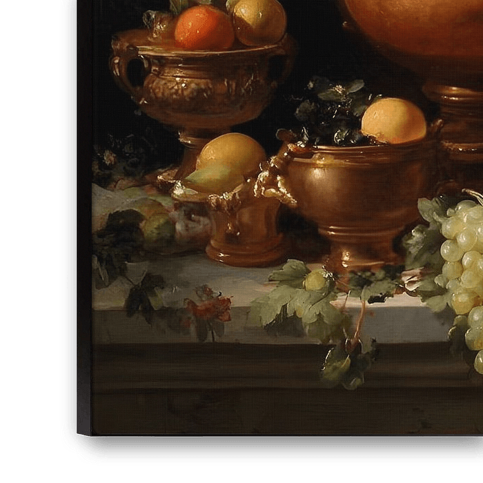 The painting shows a magnificent still life in the style of the Old Masters. Lush fruit is draped on a stone ledge: Grapes, oranges, lemons and dark grapes, accompanied by ornately decorated golden vessels and a large vase of roses. In the background, a wide view of a Mediterranean coastal landscape opens up: gently rolling hills, light-coloured villas, cypresses and the deep blue of the sea with small sailing boats stretching to the horizon. The atmosphere is rich, sensual and characterised by festive opulence. The interplay of light and shadow lends the still life depth and an almost tactile presence. The background conveys tranquillity and expanse, while the foreground tells of abundance and prosperity. It is a depiction of joie de vivre, pleasure and the harmony between nature and culture - a celebration of the Mediterranean lifestyle.