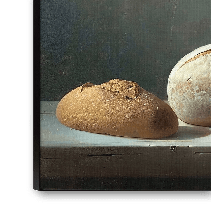 Still life - This still life painting shows rustic breads next to artistic ceramic vases and subtle garlic, all set against a dark green background with rough texture.