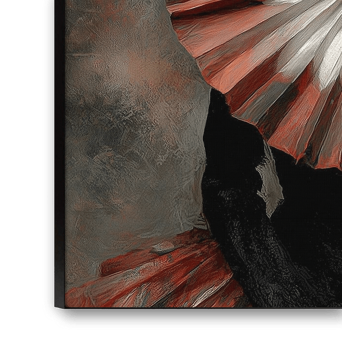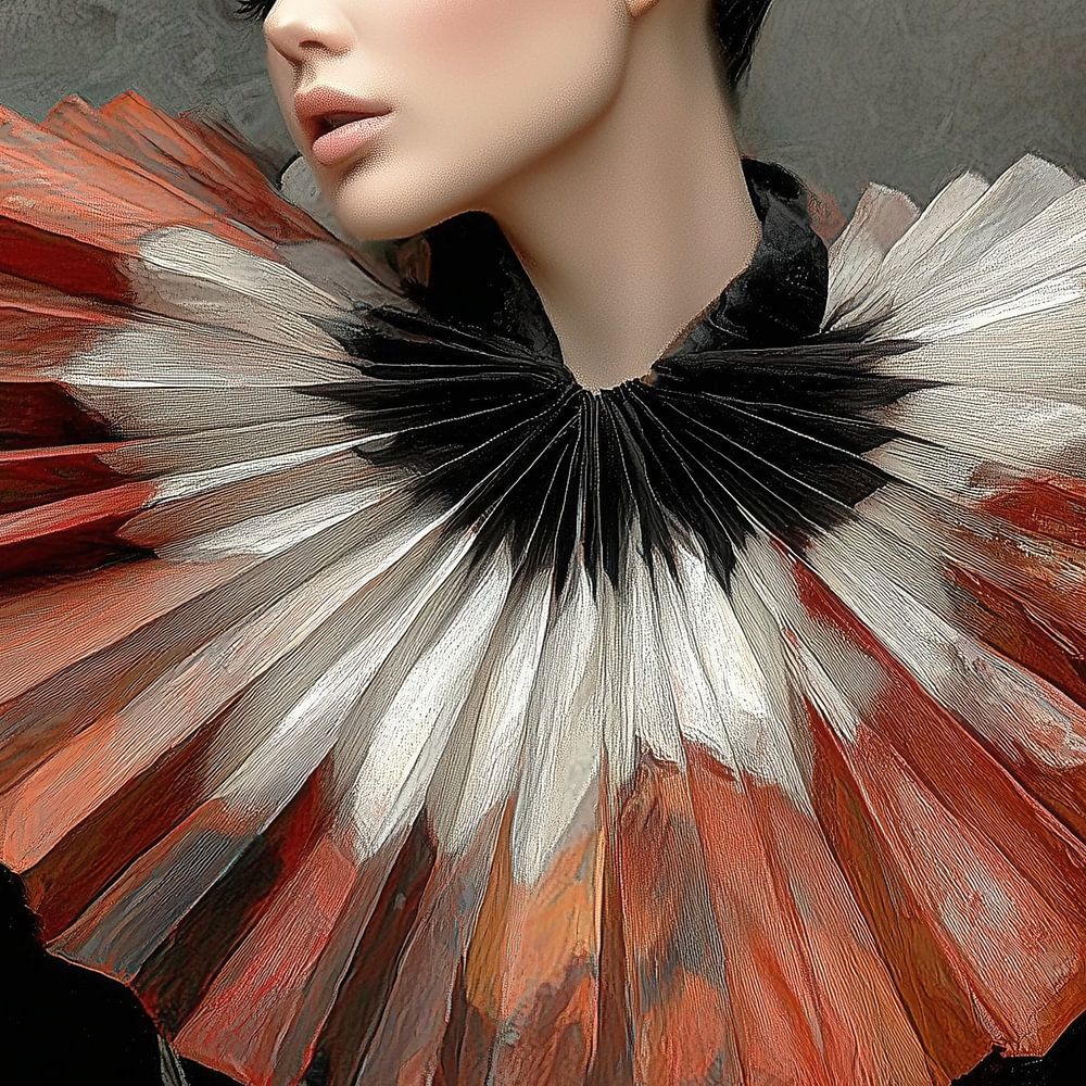 An elegant woman enveloped in an expressive, fan-like collar of red, white and black hues. Her pose radiates stillness and gentle melancholy, as if she is hovering between reality and dream. The textures and colours give the work a painterly, almost poetic character.