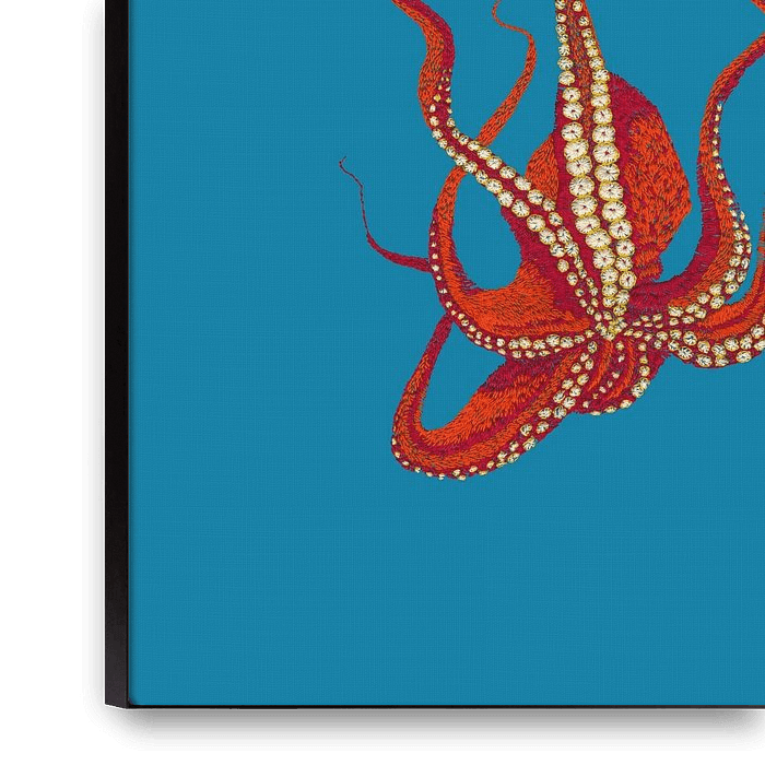 Colourful embroidery of a red-orange octopus on a blue background. The embroidery was handmade, scanned at high resolution and then placed freestanding on a blue background.