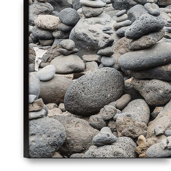 The picture shows a natural landscape with numerous stone pyramids that have been carefully constructed from stones of different sizes and shapes. The stones vary in colour and texture, from smooth black surfaces to rough grey structures. This variety gives the picture depth and visual tension.