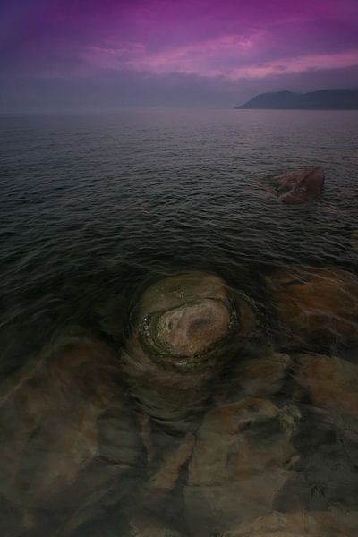 Stones in clear water on Lake Baikal. Harsh rainy purple sky at s