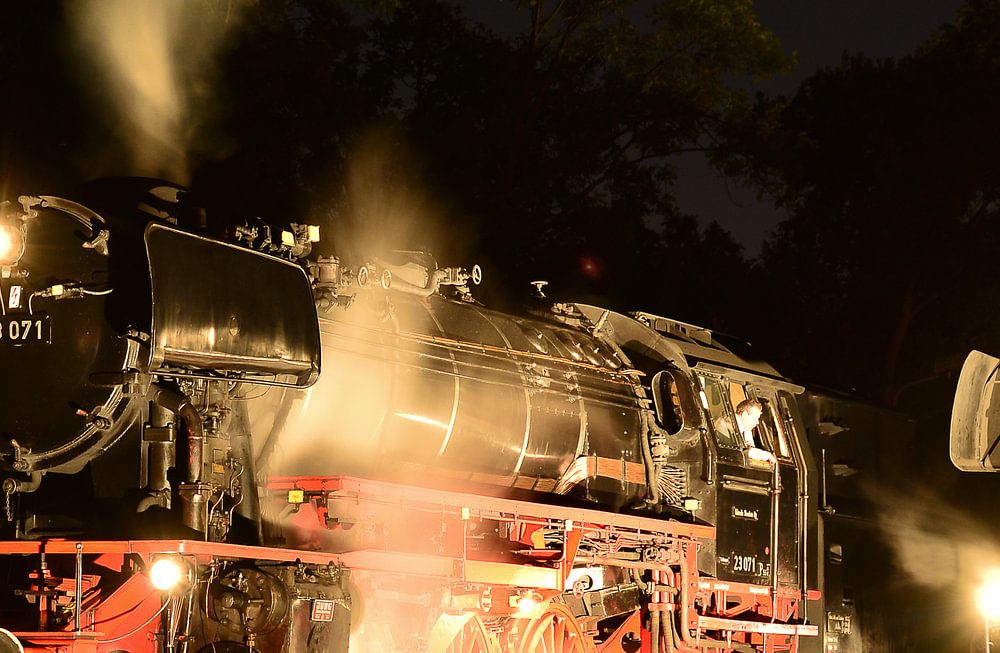 Stoomtrein onder stoom gefotografeerd tijdens de Nachtparade bij Stoom Stichting Nederland.