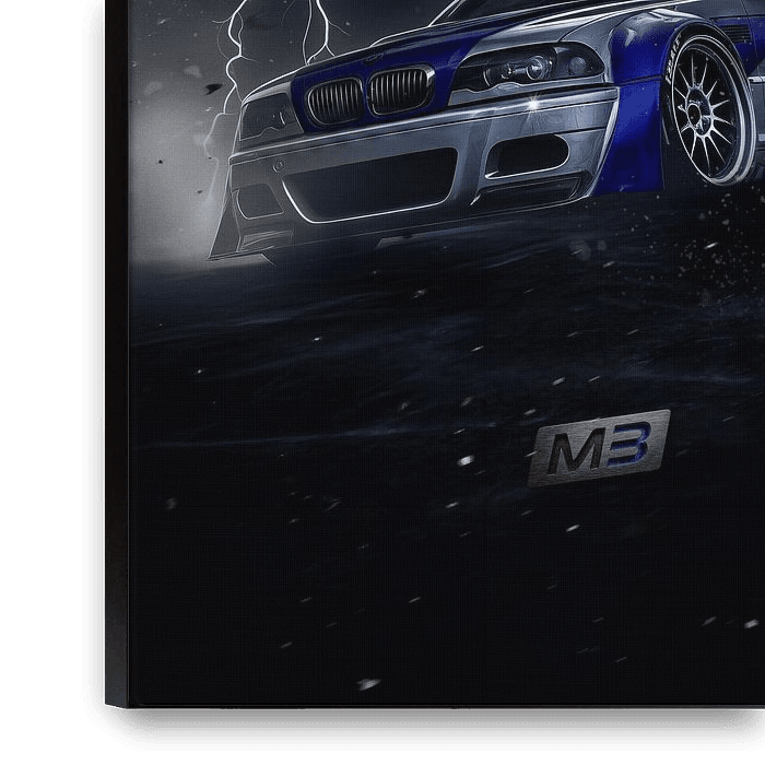 A legendary BMW M3 GTR stands defiant against a chaotic thunderstorm. The striking blue and silver livery gleams under bolts of lightning, capturing a perfect blend of high-speed adrenaline and the raw power of nature in one dramatic frame.