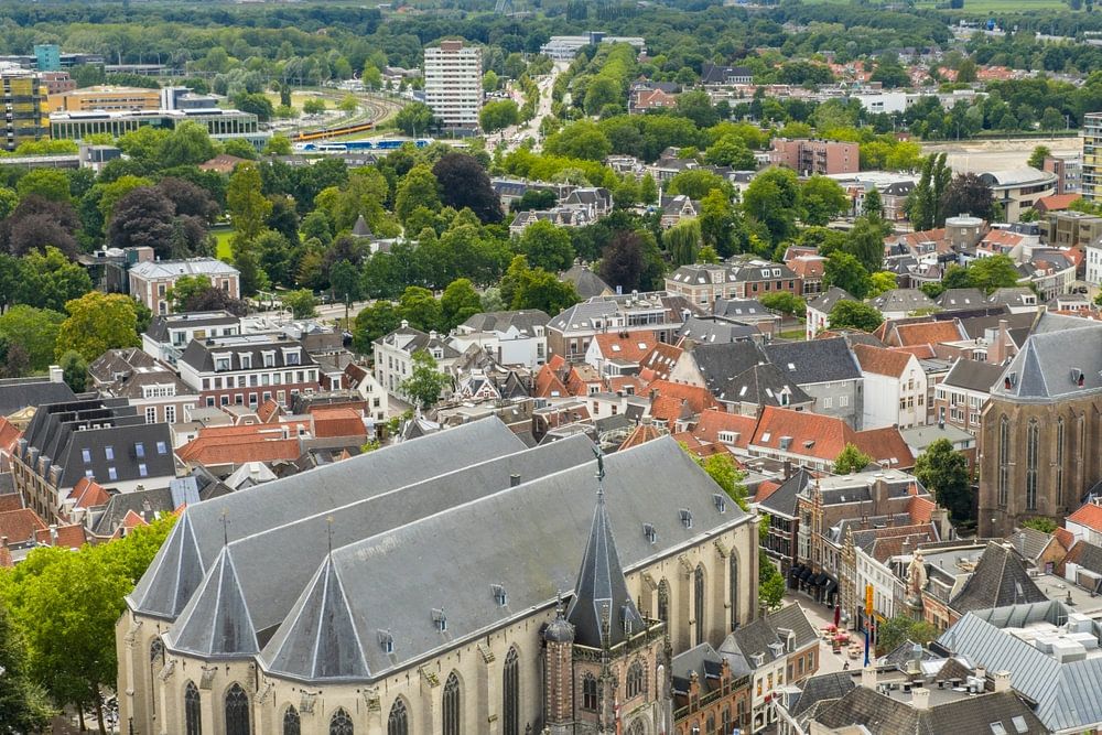 Storm clouds over downtown Zwolle during a summer thunderstrom at the end of a warm and humid summer afternoon. Dark rain clouds are approaching over the rooftops in the city centre.