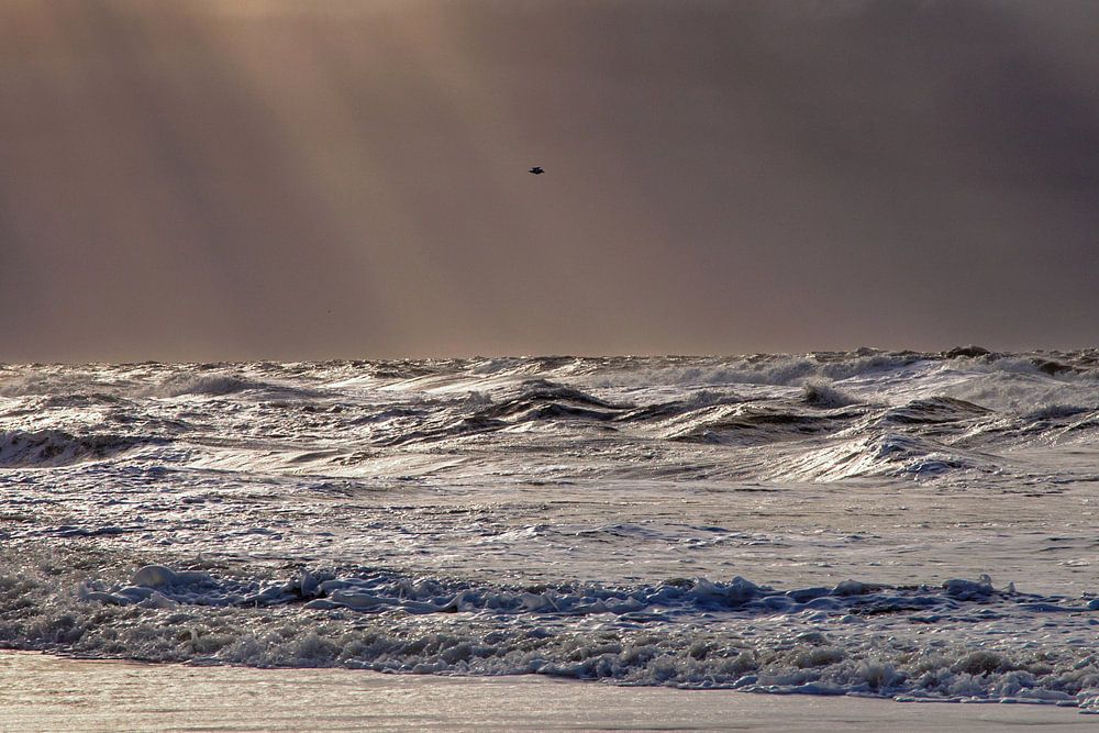 Drijgende lucht met kleine openingen in de wolken waar de zon doorheen kan breken aan het strand van Texel.