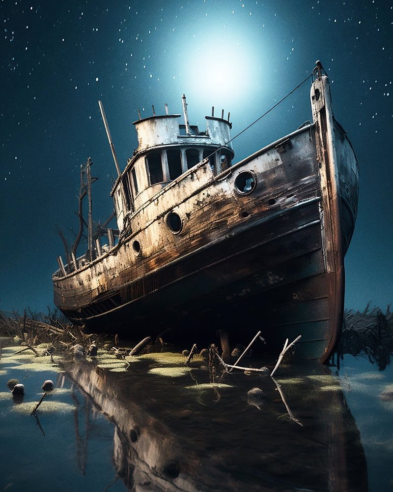 Buy this landscape artwork Stranded boat at night by fernlichtsicht on canvas, ArtFrame, poster and wallpaper, printed on demand in high quality.