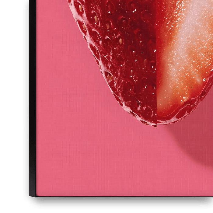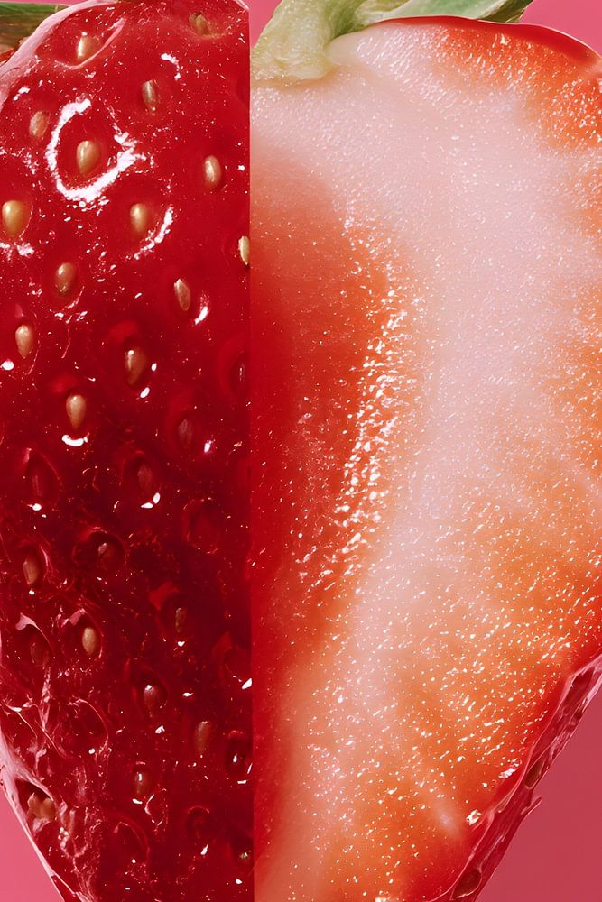 A strawberry floats against a monochrome pink background, split exactly in half: on the left, the glossy, flawless outer skin with seeds; on the right, the cut-open, juicy interior. The stark contrast between the surface and the interior is emphasised by reflections of light. The composition is minimalist, almost clinically precise, yet…