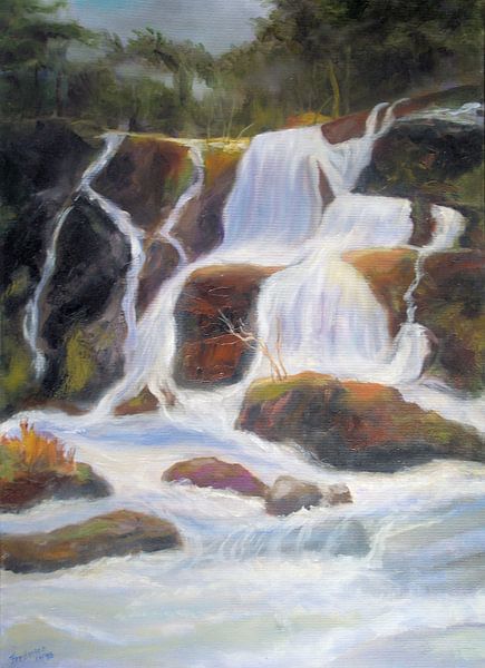 "Stream of Light and Water" depicts the beauty of a multi-layered waterfall making its way through a rocky landscape with strength and elegance. The clear falling water contrasts beautifully with the dark rock walls and soft greenery of the surrounding nature.