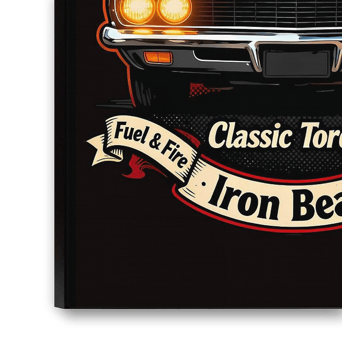 This dynamic artwork captures the raw power and timeless allure of a classic American muscle car, prominently featuring a sleek, black model with its bright headlights glowing. The intricate chrome bumper and formidable grille are depicted with striking detail, hinting at its robust engineering. Encircling the vehicle are vibrant, stylized flames and a radiating sunburst, creating an intense aura of energy and speed. The textual elements like 'Street Legends' and 'Iron Beast' further underscore its legendary status and untamed spirit. Inspired by the golden age of American automotive culture, this piece evokes the thrill of the open road and the deep-seated passion for vintage machinery. It radiates a powerful, nostalgic, and energetic atmosphere, celebrating an era of engineering excellence and bold design. Perfect for any space that cherishes a love for classic cars, speed, and retro Americana, it serves as a captivating statement piece that ignites conversation and brings a high-octane spirit to a garage, man cave, or living room.