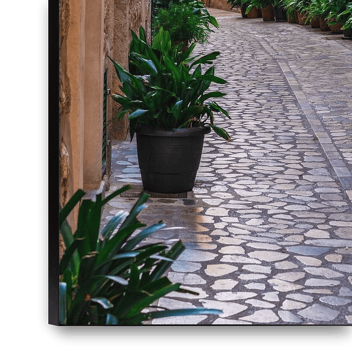 Buy this flower art Street in the old famous village of Fornalutx by Alex Winter on canvas, ArtFrame, poster and wallpaper, printed on demand in high quality.