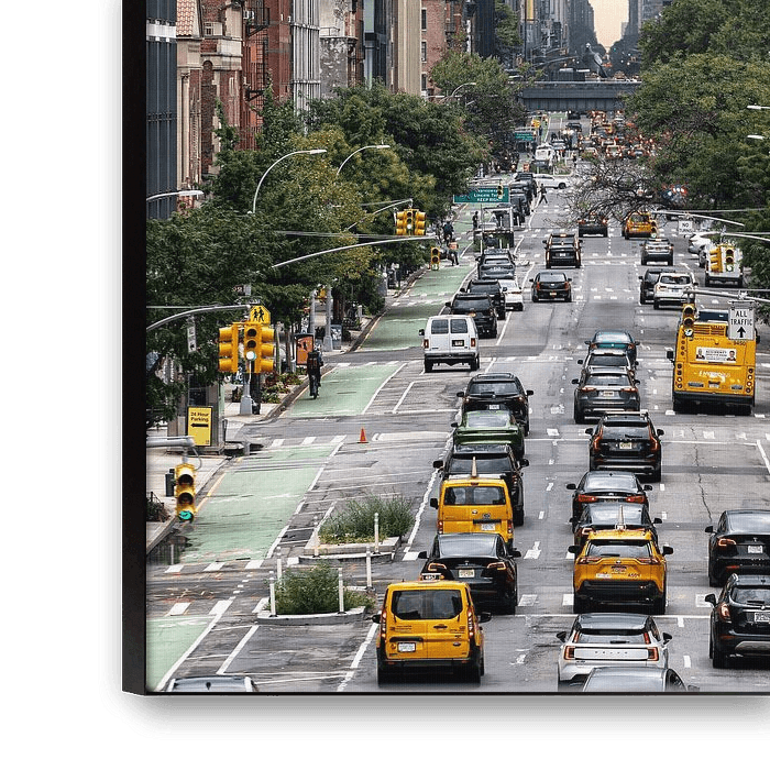 View of 10th Avenue in the Chelsea district of Manhattan, New York City. This street scene shows the typical atmosphere of this metropolis, with its skyscrapers and yellow taxis.