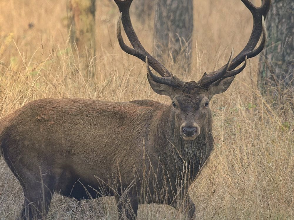 Majestic male deer in the late afternoon in autumn. The faint light caresses the barren grass between the trees. The red deer is alert and looks straight into the lens, revealing its grand antlers in full view.