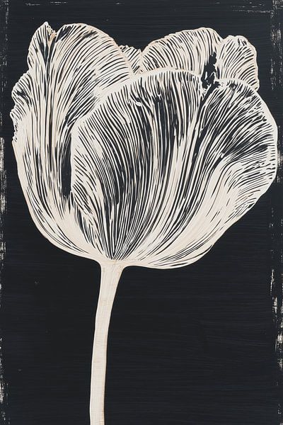 A dramatic vertical piece featuring a single tulip bloom in fine white line art against a solid black background. The intricate banding of the petals is captured with rhythmic, flowing lines that give the flower a luminous quality.