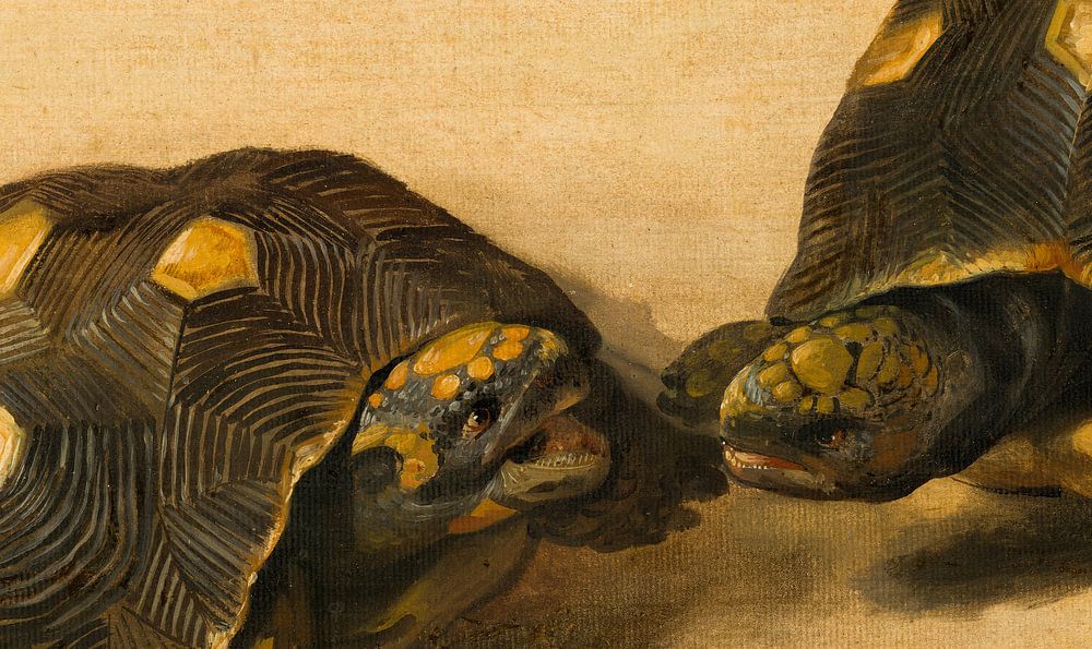 Johan Maurits, governor of the Dutch colony in Brazil and owner of the Mauritshuis, took several artists with him to South America, to record the people, the flora and fauna, and the landscape. Eckhout was one of these artists. He painted the two tortoises with their scaly heads and geometrically-patterned shells in great detail. The animals are facing one another aggressively, ready to fight.