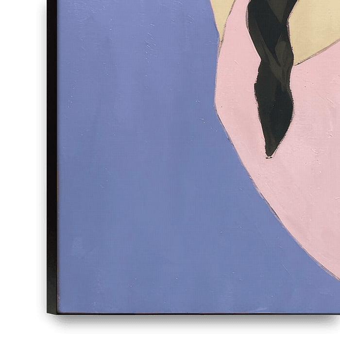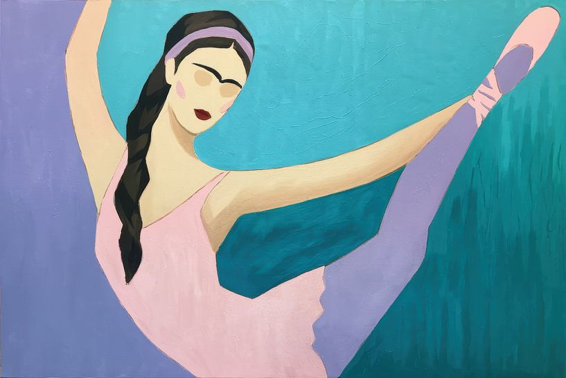 A stylised ballerina stretches her leg in a high arabesque, constructed from clean lines and flat, soft areas of colour. The subtle contrast between lilac and turquoise provides balance and tranquillity, while the elongated silhouette exudes elegance and focus. Geometric shapes define the composition, with a clear face and flowing…