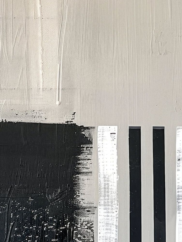 This artwork, called "Stylish Contrast n.1", plays with the power of opposites. The abstract design combines sharp lines and organic shapes in a palette of black, white and a touch of beige. The contrasting composition weaves through each other with a playful interplay of shapes and stripes. The sharp lines create a sense of dynamism and energy, while the organic shapes add a touch of softness and balance. The subtle use of beige adds a warm and inviting touch to the otherwise clean black and white palette. This artwork invites contemplation and lets the viewer experience the power and beauty of contrasts in a stylish and sophisticated composition.