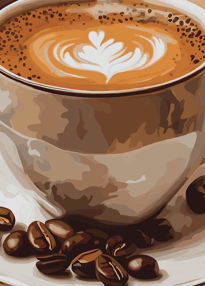 This artistic picture shows a steaming cup of cappuccino with elegant latte art decoration on creamy milk foam. The cup stands on a white saucer, surrounded by roasted coffee beans that make the flavour tangible. The warm, brown colour of the background enhances the cosy atmosphere and lends the motif a harmonious depth. The detailed depiction captures the perfect moment of relaxed coffee enjoyment and conveys a feeling of cosiness and pleasure.