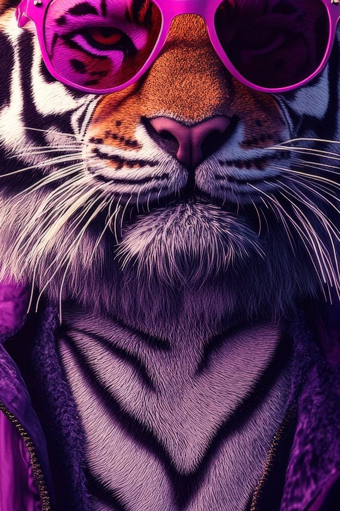 A cool tiger with sunglasses and a dazzling purple shirt radiates an incomparable blend of wildness and style. The bright colours and unconventional look add a dose of joie de vivre to any room. This artwork is perfect for a modern living room that encourages individuality and conversation.