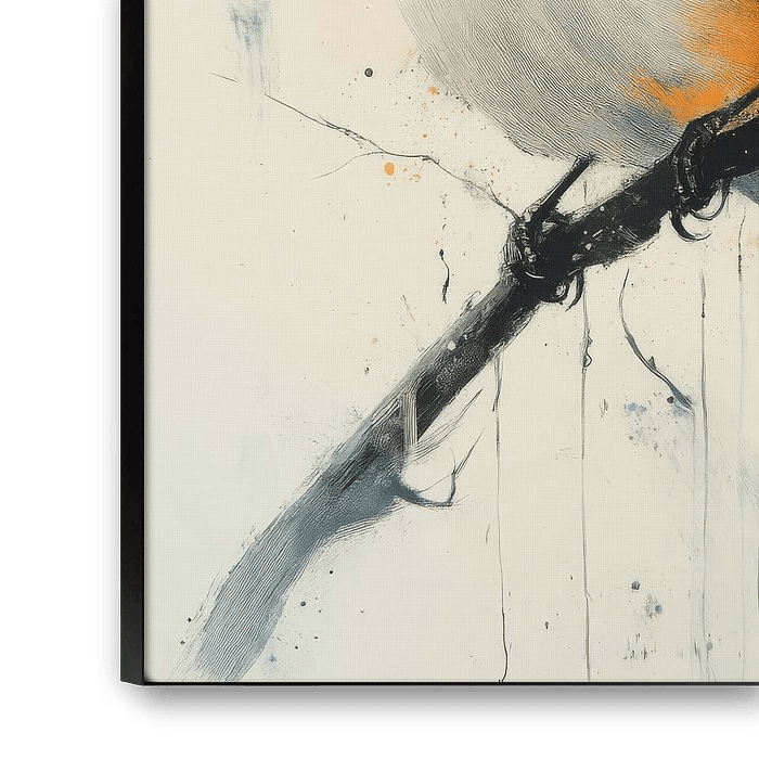 This artwork depicts a delicate blue bird with a warm orange breast, sitting on a thin branch. The subtle brushstrokes and splashes of ink add a playful and artistic flair, while the minimalist background focuses on the bird. A wonderful choice for lovers of modern and sophisticated nature art.
