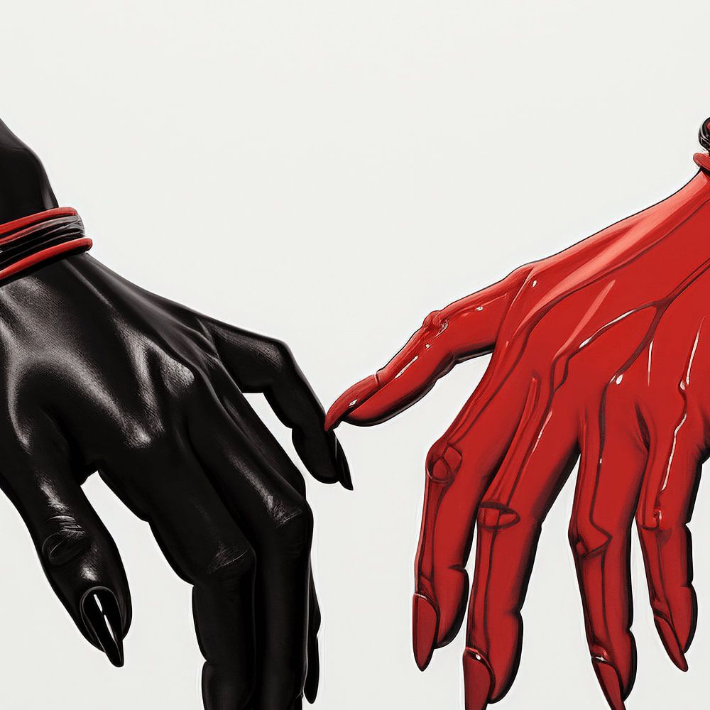 The beauty of this work lies not only in that subtle touch but also through the use of the contrasting colours red and black. The minimalist image and the almost abstract shapes of the hands are enhanced by the white background.