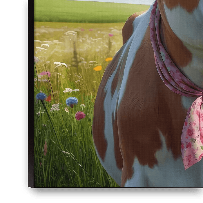 A cheerfully decorated cow stands in a blossoming summer meadow, wearing sunglasses, a flower crown and a pink neckerchief – a humorous, sunny moment full of lightness.